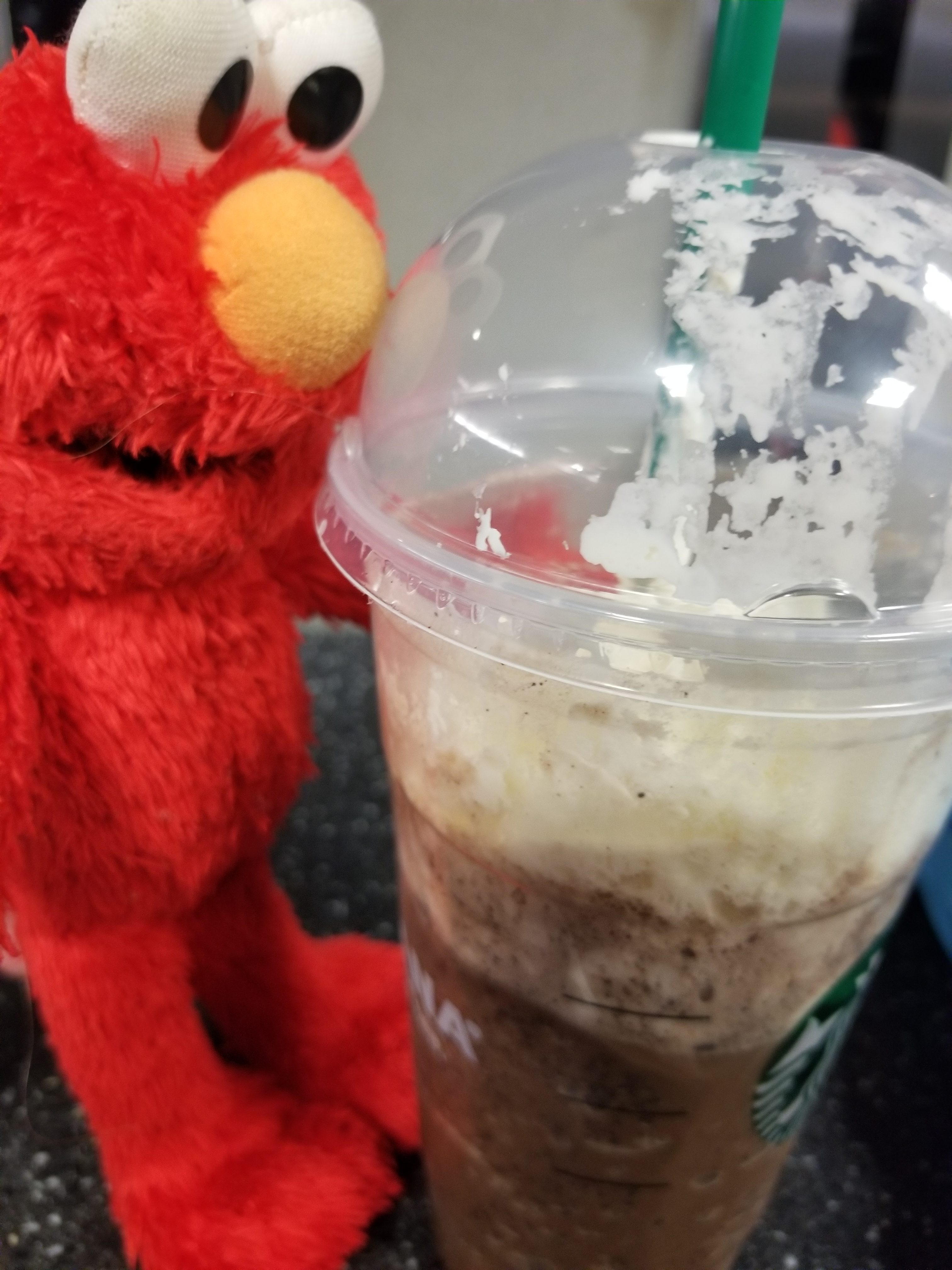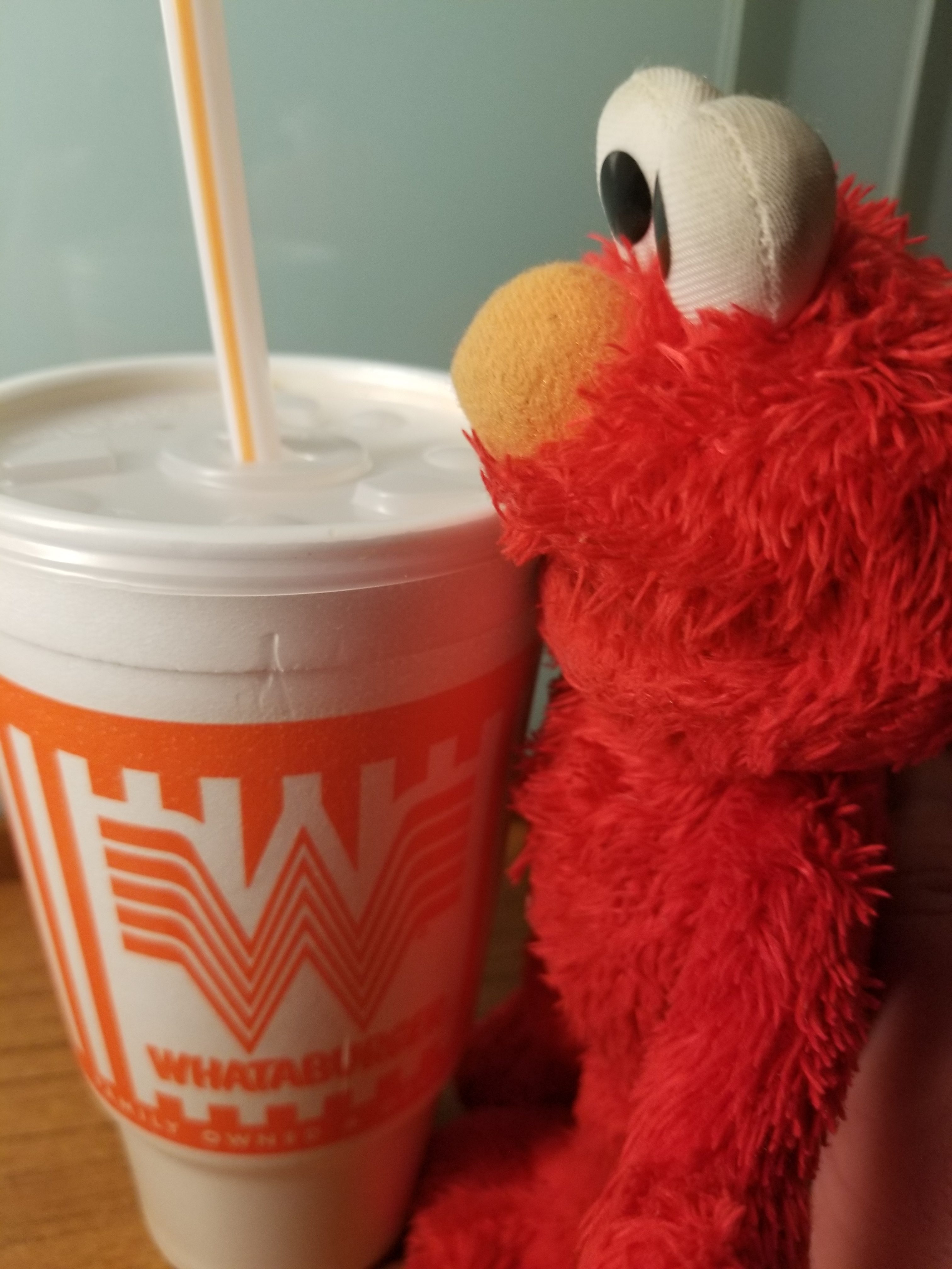 - Elmo is so hungry he tries to eat the drink! Silly Elmo.