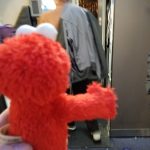 - Elmo checks the overhead bins — no luggage here!