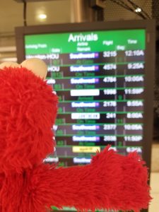 Elmo checks which carousel he needs for his bags.